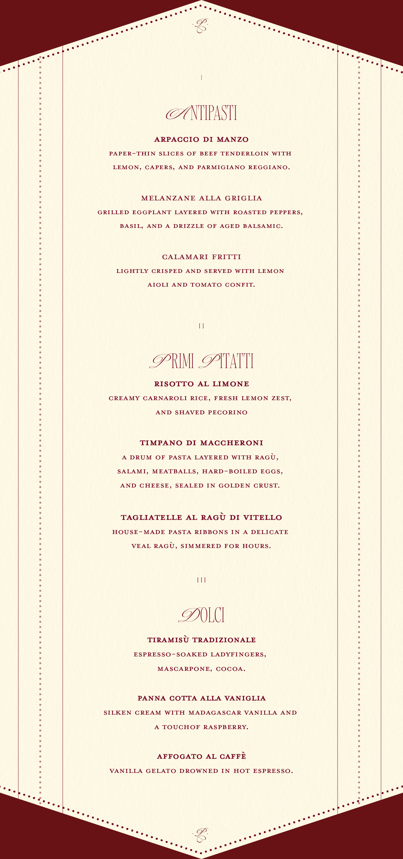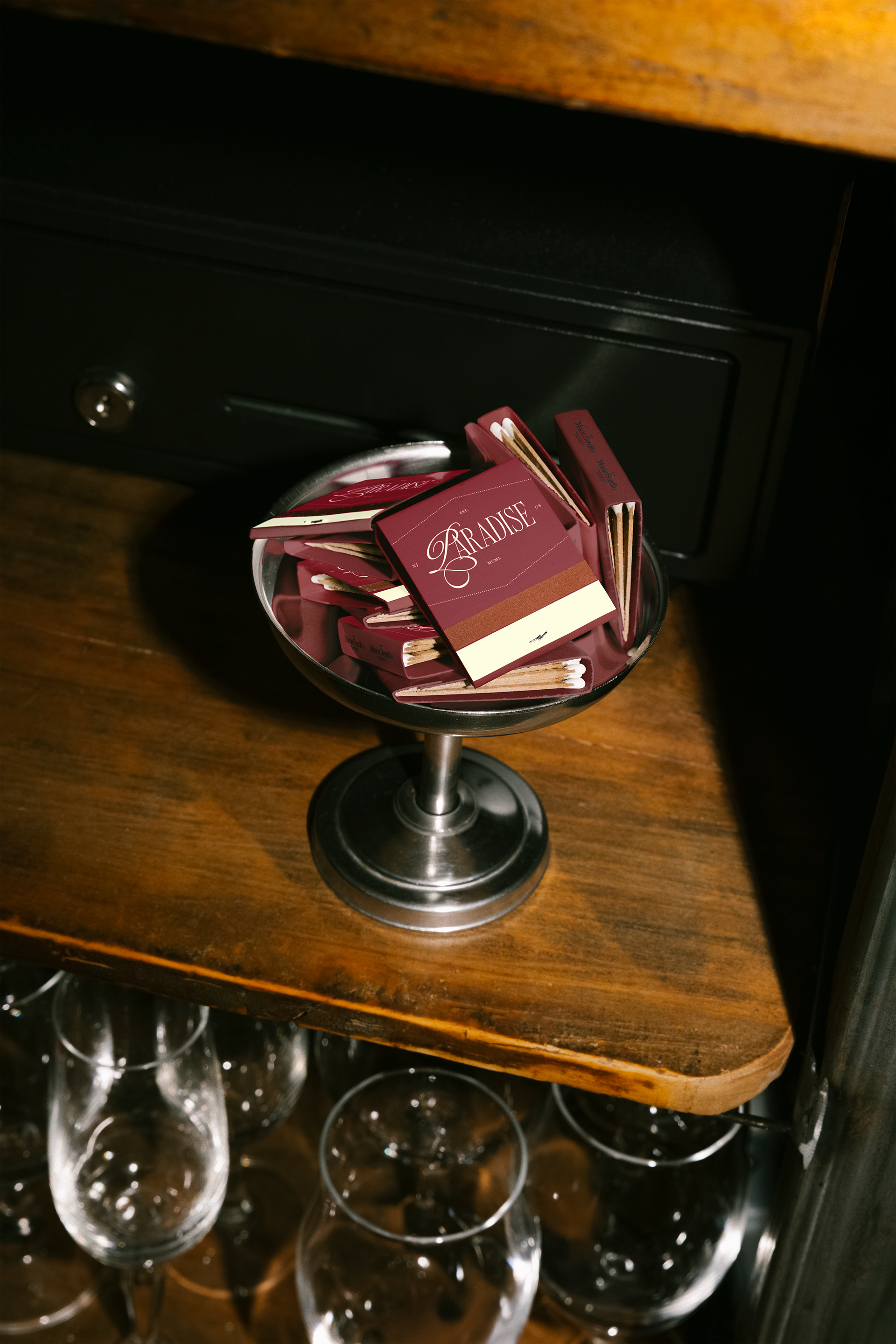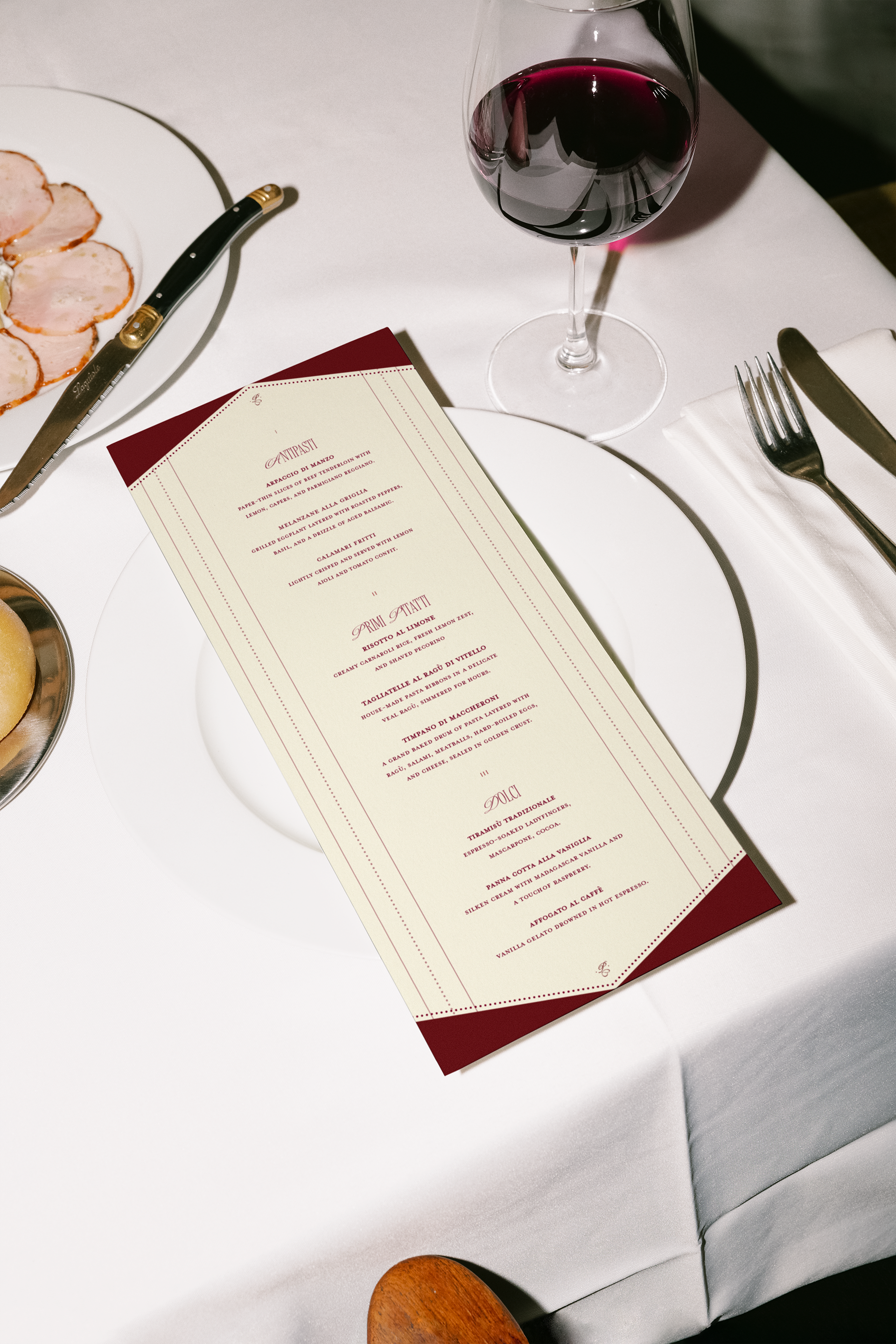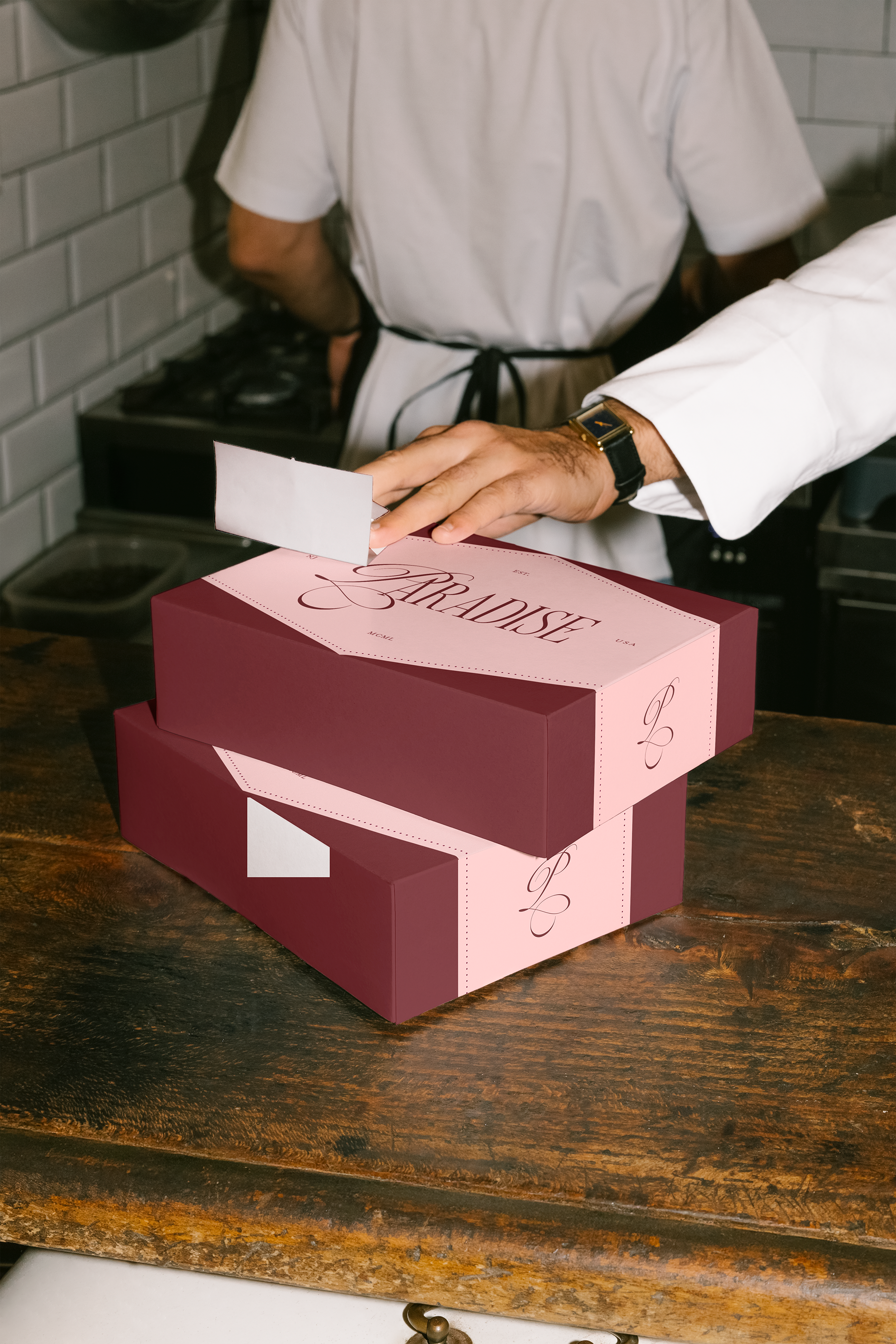 This brand identity is a visual refresh for Paradise in the film Big Night, bringing its candlelit romance to life. For this project, I created a romantic wordmark and monogram, paired with a wine-and-cream palette to carry the mood across menus, matchbooks, and packaging.
